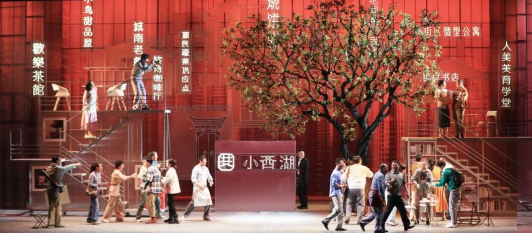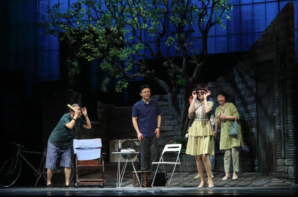 话剧《小西湖》围绕街区更新改造过程中关于文化、建设、邻里、爱情的有趣故事展开。本次打磨提升对话剧进行了从台词、表演、道具、服装、舞美、灯光等方面全方位的调整,全组人员在导演傅勇凡的指导下加班加点、入戏入情、不断提升改进剧目的效果质量。