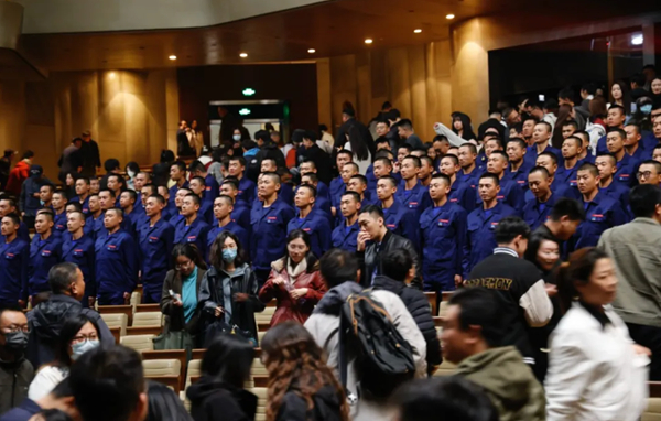 演出谢幕,当舞台上的演员向台下观众敬礼致谢时,消防指战官兵齐齐敬礼,向演员、向这段革命历史、向为了”人间正道“而奋斗的每一位仁人志士致敬,现场无不为这一段跨越了时空与历史的无声对话而感动,台上演员也为此感动落泪,多次谢幕致意。