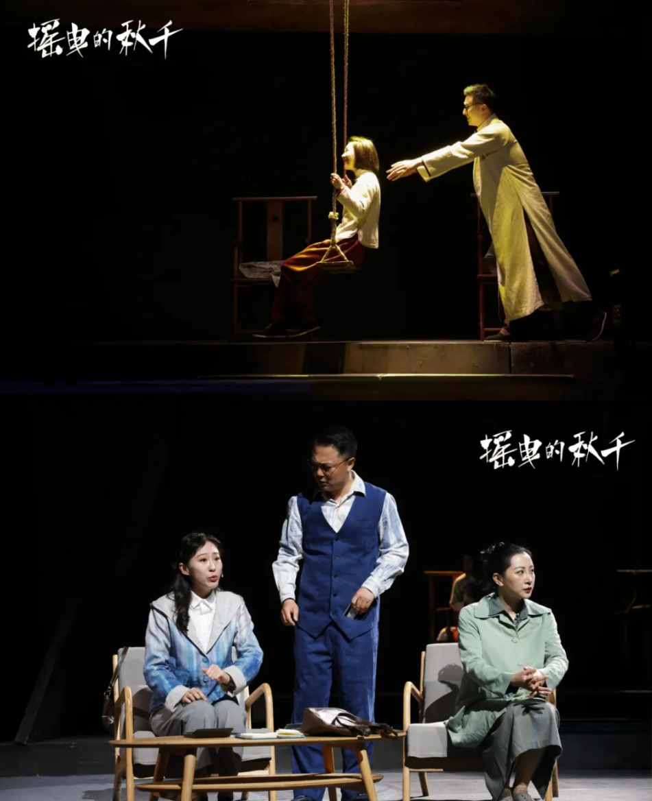 “剧中念童谣的声音是我女儿录制的,孩子的天真烂漫和秋千的摇曳、时局的动荡形成了鲜明的反差。”导演李珺告诉表示《摇曳的秋千》力求用极简舞台构筑情感宇宙,“倾斜的巨型秋千贯穿了整部剧,既是童年回忆的载体,更是时代命运的象征。剧中人物从年轻到年老的转场过渡,我们都是通过灯光、舞美、音响等一些细节实现的,很巧妙。”