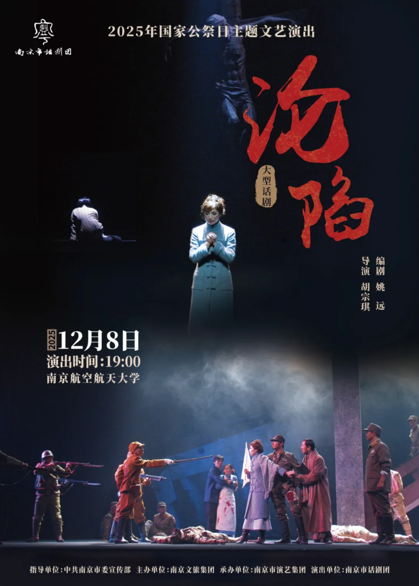 2025年是中国人民抗日战争暨世界反法西斯战争胜利80周年,也是南京大屠杀惨案发生88周年。12月8日晚,2025 年国家公祭日主题文艺演出——南京市话剧团大型原创话剧《沦陷》在南京航空航天大学上演。