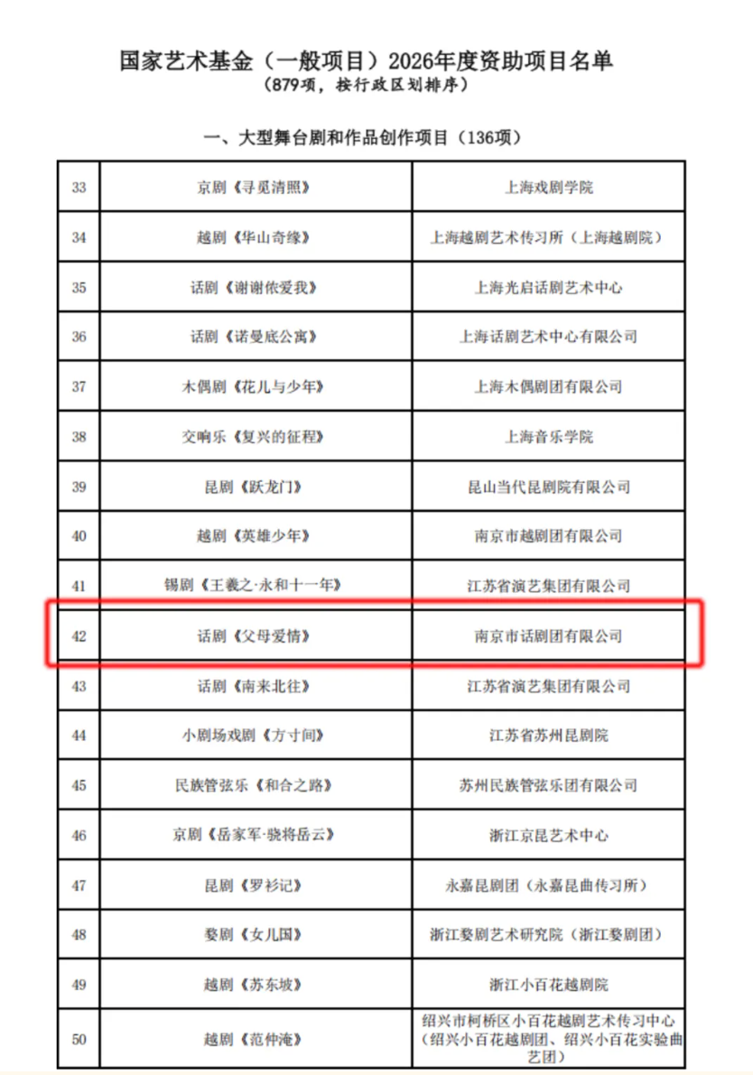 近日,国家艺术基金(一般项目)2026年度资助项目名单公示,由中共南京市委宣传部出品,南京市文化和旅游局、南京市文化艺术界联合会、南京文旅集团、南京市演艺集团联合出品,南京市话剧团创作演出的话剧《父母爱情》入选国家艺术基金2026年度资助项目大型舞台剧和作品创作项目。