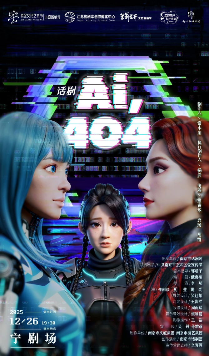 2025年12月26日,由南京市话剧团出品、中共南京市玄武区委宣传部联合出品、南京文旅集团、南京市演艺集团制作、南京市话剧团创作演出的小剧场话剧《Ai,404》将亮相紫金小剧场戏剧展演活动。